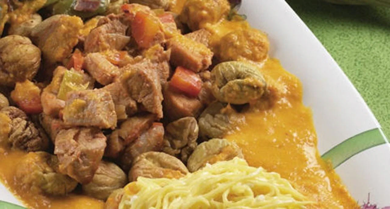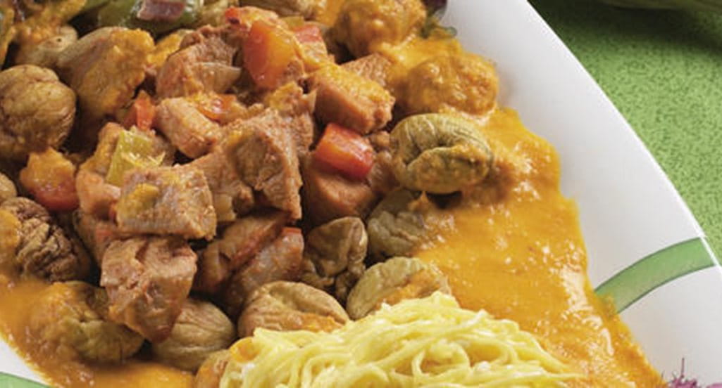 - Corte a carne de porco em cubos e polvilhe com o Tempera Fácil para Assados. Frite a carne numa frigideira com o azeite quente até ficar douradinha. Frite as castanhas no óleo quente e escorra sobre papel absorvente. Misture as castanhas com a carne e conserve quente.