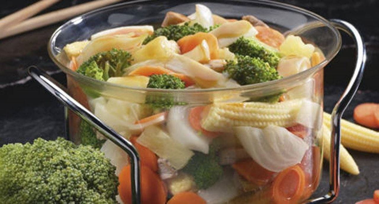 - Corte as bifanas de porco em tirinhas. Derreta a margarina Vaqueiro no prato dourador durante 1 minuto na potência média. Junte as tirinhas de carne e leve ao microondas durante 6 minutos na potência máxima, mexendo de dois em dois minutos. Retire a carne e junte à gordura que ficou, a cebola descascada e cortada em gomos, a cenoura pelada e cortada em fatias finas e a raiz de bambu, cortada em lâminas. Leve de novo ao microondas durante 4 minutos na potência máxima, mexendo a meio do tempo. Lave e separe os brócolos em raminhos. Coloque-os num recipiente com tampa, junte a água e leve ao microondas durante 4 minutos na potência máxima, mexendo também a meio tempo. Junte a carne e os brócolos aos restantes legumes, tempere com sal e pimenta e reserve.