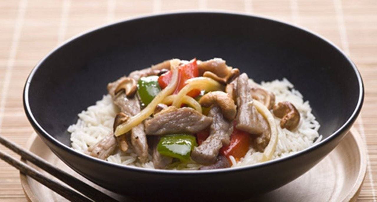 - Depois da carne estar dourada, aumente o calor e junte os pimentos e os rebentos de bambu.
