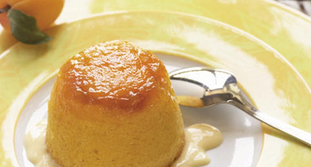 - Unte com margarina Vaqueiro 4 recipientes individuais próprios para microondas e coloque no fundo de cada 1 colher de sobremesa de doce e meio alperce previamente pelado e descaroçado.