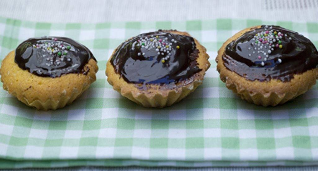 - Junte as natas, leve ao microondas durante 45 segundos, de seguida adicione a Vaqueiro líquida e mexa energicamente com uma vara de arames até derreter completamente o chocolate. Deixe arrefecer. Deite o chocolate sobre a superfície dos queques e polvilhe com as pepitas de chocolate.