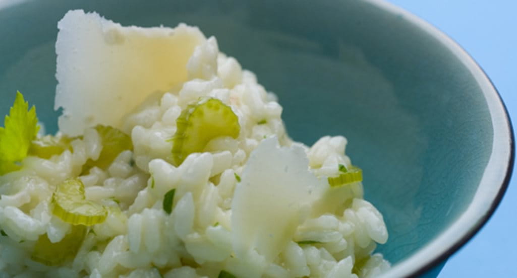 - Quando o risotto estiver quase pronto, adicione-lhe as folhas de aipo picadas e misture bem.