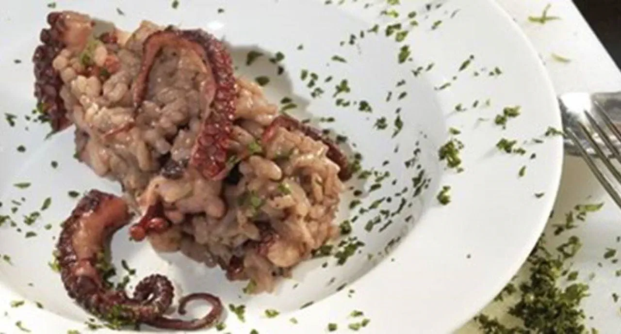 - Retire o polvo da panela, depois de ter deixado escapar a pressão. Junte o caldo da cozedura ao risotto e corte o polvo em troços.