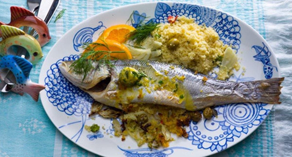 Robalinhos com “manteiga de laranja” recheados com cuscuz