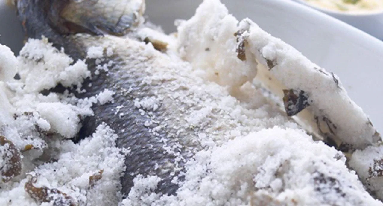 - Cubra o fundo de um recipiente de forno com uma camada do sal preparado, por cima coloque o peixe e cubra-o com uma camada espessa de sal, deixando apenas o rabo e a cabeça de fora. Leve ao forno durante cerca de 30 minutos.