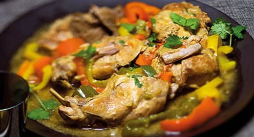 - Entretanto, descasque a cebola e corte-a em meias luas. Limpe os pimentos de sementes e películas brancas e corte-os em tirinhas.
