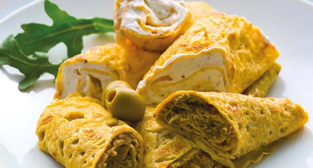- Barre cada crepe de ovo com o recheio escolhido, enrole como se fosse uma torta e corte em troços com cerca de 2 cm de largura.