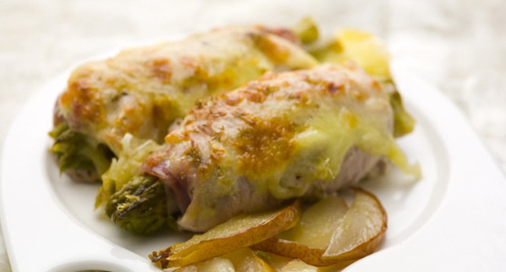 - Escorra os espargos, distribua-os pelas fatias de fiambre e enrole. Coloque os rolos obtidos sobre os bifes de peru e volte a enrolar. Se achar necessário prenda com um palito e coloque os rolos de carne sobre um tabuleiro com a união virada para baixo.