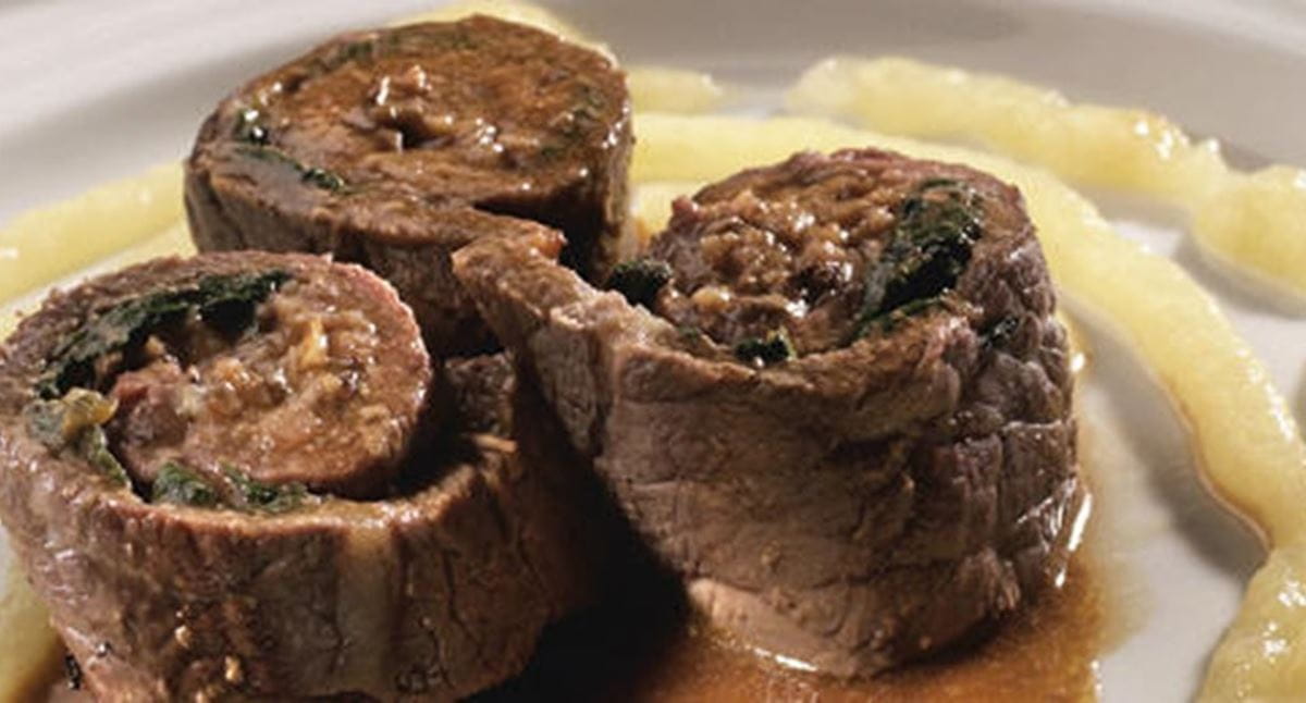 - Distribua os espinafres pelos bifes de vitela por cima coloque ¼ do recheio preparado e enrole cuidadosamente. Coloque os rolinhos de carne sobre um tabuleiro de forno, com as pontas dos bifes voltadas para baixo. Por cima espalhe metade daVaqueiro Líquidae leve a assar no forno cerca de 30 minutos ou até estarem douradinhos. Regue várias vezes com o molho que se vai formando.