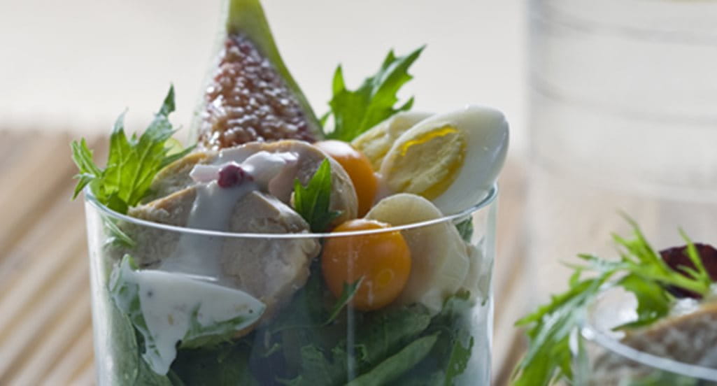 - Derreta a Vaqueiro Refogado numa frigideira, junte os peitos de frango e deixe alourar de ambos os lados. Tempere com sal e pimenta moída na altura, regue com sumo do limão e salpique com orégãos, Reduza o lume, tapa e frigideira e deixe cozinhar sobre lume brando durante cerca de 10 minutos.Ao mesmo tempo coloque os ovos de codorniz num tachinho, cubra com água e tempere com sal. Leve ao lume, ferva durante 5 minutos, escorra e deixe arrefecer. Entretanto retire as folhas às physalis e lave-as juntamente com os bagos de uva. Abra os bagos ao meio e limpe-os de sementes. Lave os figos e corte-os em quartos. Escorra os palmitos de conserva e corte-os em troços pequenos.Retire o frango e corte-o em fatias finas ou desfie-o em tiras. Descasque os ovos de codorniz e corte-os ao meio.Coloque a mistura de rúcula, alface e agrião num prato fundo, por cima disponha os ingredientes preparados.Numa taça á parte misture a maionese e o iogurte com o suco de um pedaço pequeno de raiz de gengibre, previamente pelada e ralada. Descasque as chalotas, pique-as finamente e junte-as á mistura anterior tempere com sal e salpique com sementes de sésamo pretas e pimenta rosa moída.