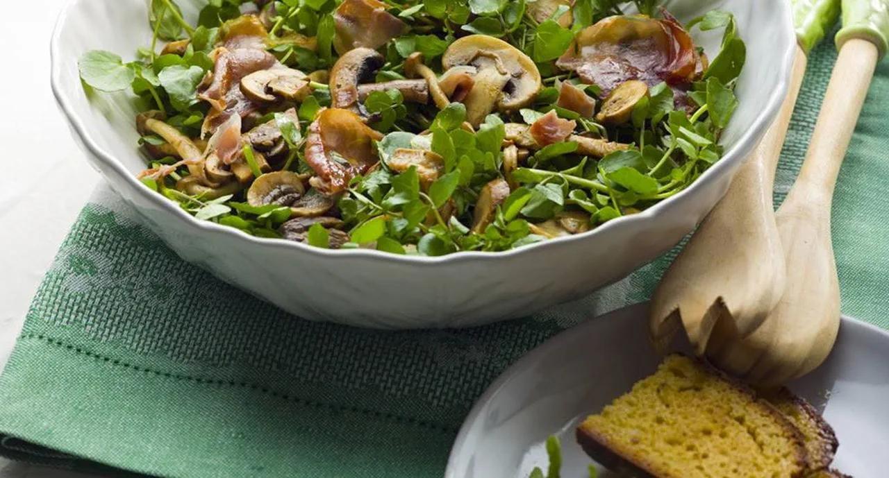 Salada de agrião e misto de cogumelos com lascas de presunto crocante