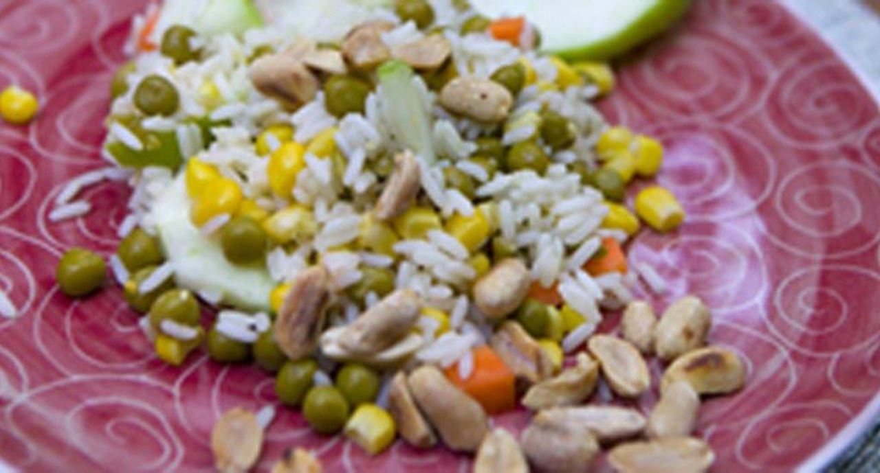 - Assim que o arroz estiver cozido, deite-o num escorredor e passe-o debaixo de água corrente até estar completamente frio. Escorra bem e junte-lhe todos os ingredientes preparados. Adicione o amendoim torrado, misture tudo e deite numa saladeira.