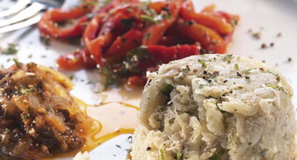 - Desfie bem as lascas de bacalhau e deite fora qualquer espinha que apareça. Ponha o bacalhau de molho em água fria e mude várias vezes a água. para dessalgar o bacalhau Deve depois ser envolvido com a cebola cortada em rodelas muito finas, dois dentes de alho picado muito finamente e uma boa porção de coentros picadinhos. Tudo deve ser temperado com azeite, algumas gotas de vinagre de vinho licoroso e pimenta preta e depois enformado em pequenas formas em aro, normalmente utilizadas para bolos de arroz. Estas formas guardam-se no frigorífico até à altura de serem servidas.