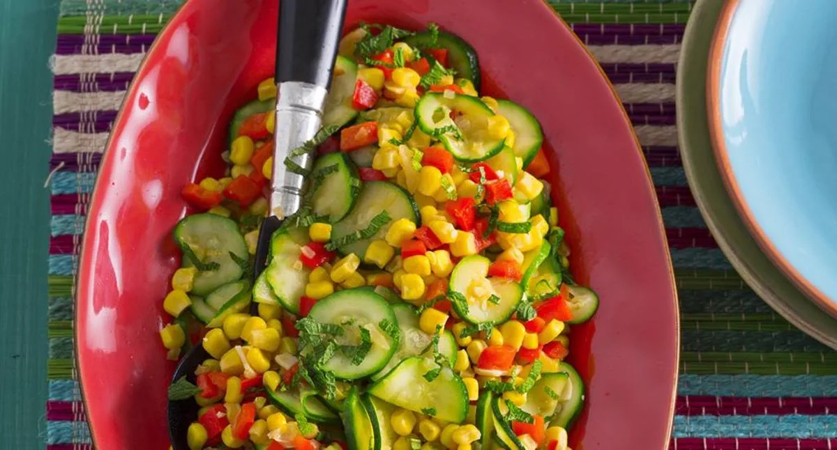 - Junte os legumes preparados à cebola, adicione o milho e tempere com sal. Misture bem, tape e deixe cozinhar sobre lume moderado a brando entre 10 e 15 minutos, mexendo de vez em quando.