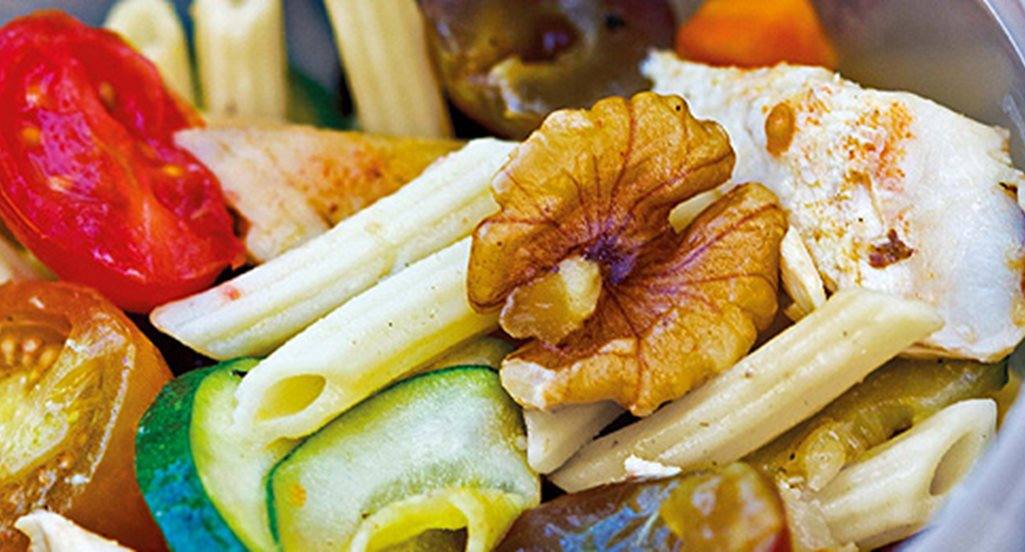Salada de frango assado com massa e legumes