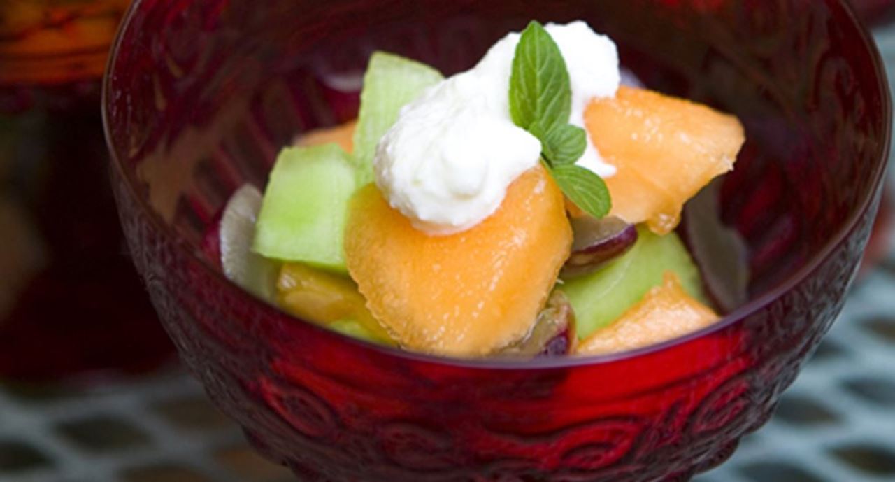 - Abra o melão e a meloa ao meio, limpe-os de sementes, corte em talhadas e tire-lhes a casca. Corte a polpa dos frutos em cubos para dentro de uma tigela.