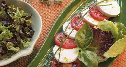- Distribua a salada pelas taças de serviço e regue com o molho. Enfeite cada taça com uma folhinha de hortelã.
