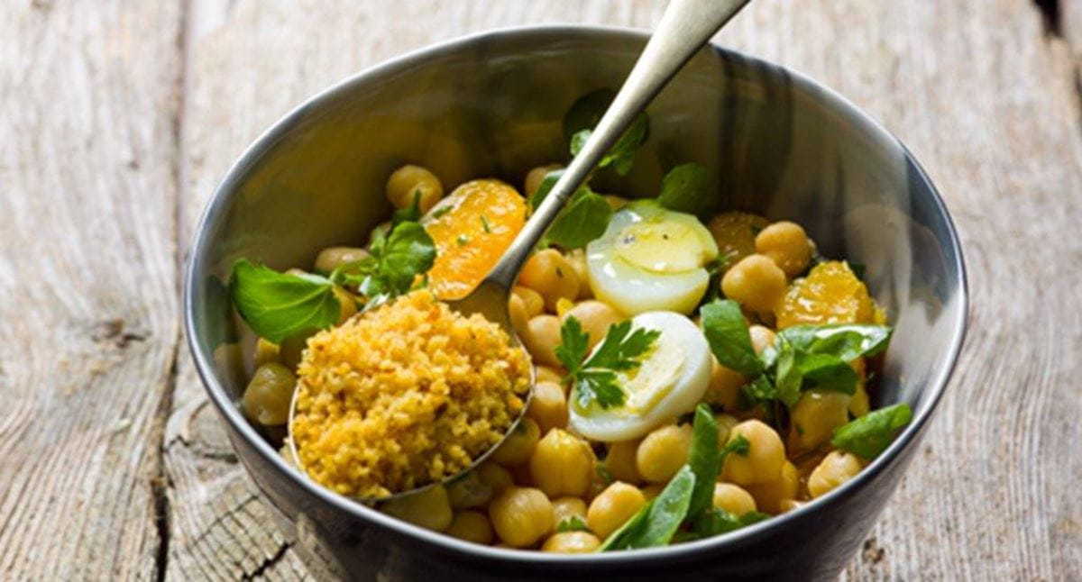 - 5. Escorra o grão, adicione-o à laranja, junte as folhas de canónigos e os ovinhos de codorniz e misture bem. Na altura de servir, salpique com a mistura de pão e ervas aromáticas.