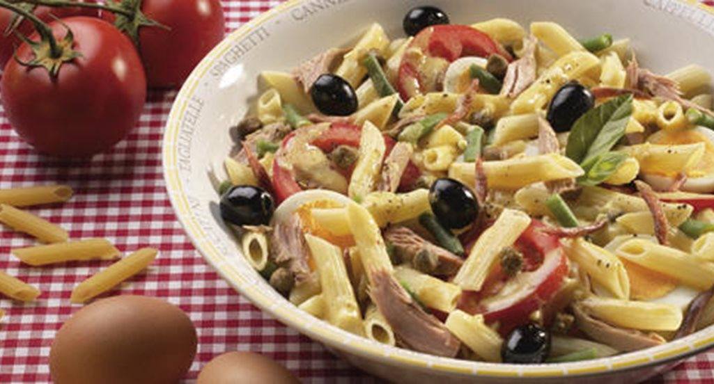 - Descasque e corte os ovoscozidos em rodelas, disponha-as no centro da salada, enfeite com os filetes de anchova, as alcaparras e as azeitonas pretas. Regue com o restante molho e enfeite com folhinhas de manjericão.