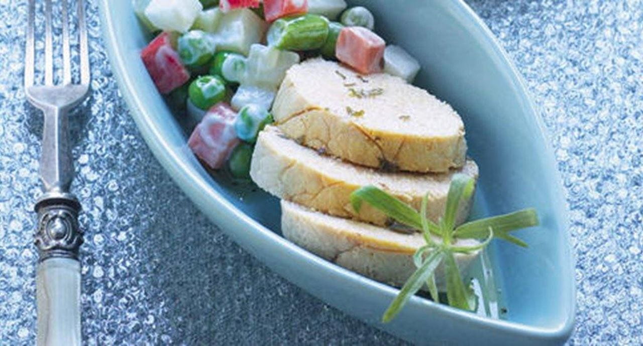 - Depois de frias, corte as ovas em rodelas. Misture o azeite com o vinagre com a ajuda de um garfo e deite sobre as ovas, misture cuidadosamente e disponha as ovas temperadas em torno da jardineira.