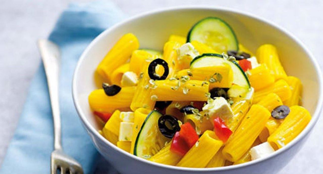 - Corte o queijo Feta aos cubos e pimento aos cubinhos. Quando a massa estiver “al dente” escorra e passe por água fria até arrefecer, deite numa saladeira e junte o pepino escorrido, o queijo Feta, as azeitonas, os cubinhos de pimento e misture.