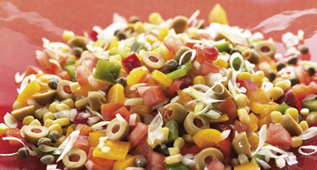 - Limpe os pimentos de grainhas e corte-os em pedaços. Descasque e pique a cebola e corte o alho francês (só a parte branca) ou o cebolo em rodelas fininhas. Lave num passador, debaixo de água corrente. Misture os pimentos com a cebola e o alho francês numa saladeira, junte o milho escorrido, os tomates, limpos de grainhas e cortado a gosto, uma colherada de alcaparras e um punhado de azeitonas.
