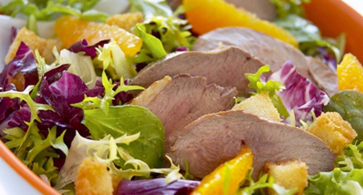 - Entretanto corte os peitos de pato em fatias finas e misture-os com a salada. Por cima deite o molho e salpique comcroutons de pão torrado.