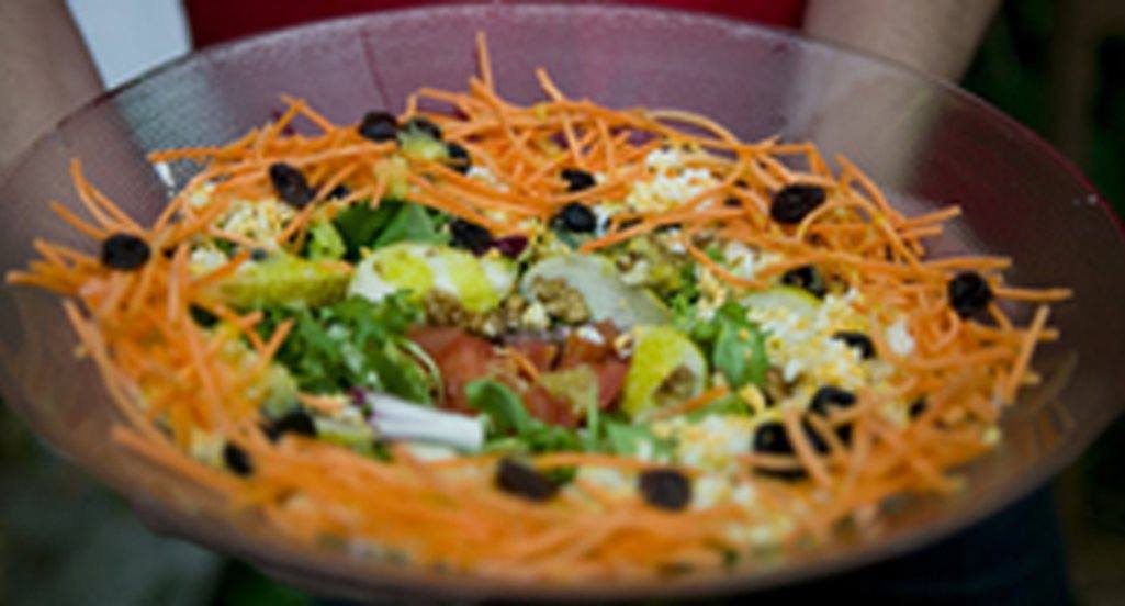 - Disponha o tomate em cubos numa fila sobre uma saladeira larga e baixa, ao lado coloque também em fila a mistura de alfaces, pêra e nozes, a seguir a mistura de ovo e azeitonas e finalmente a cenoura ralada com as passas.
