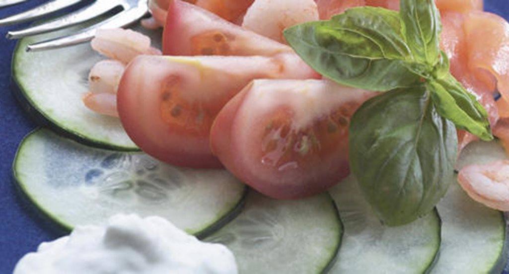 - Lave e enxugue o pepino e os tomates. Retire algumas tiras de pele ao pepino e corte em rodelas finas. Corte o tomate em gomos finos. Disponha os legumes e a mistura de salmão e camarões num prato fundo.