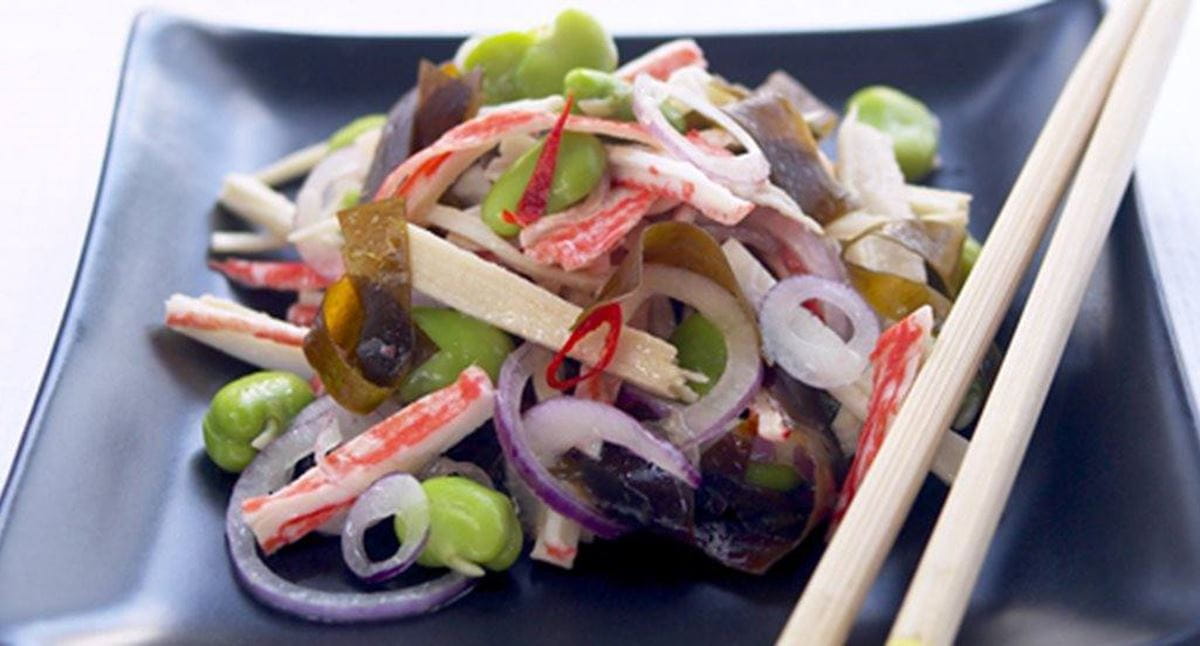 Salada de surimi com favas e algas wakame