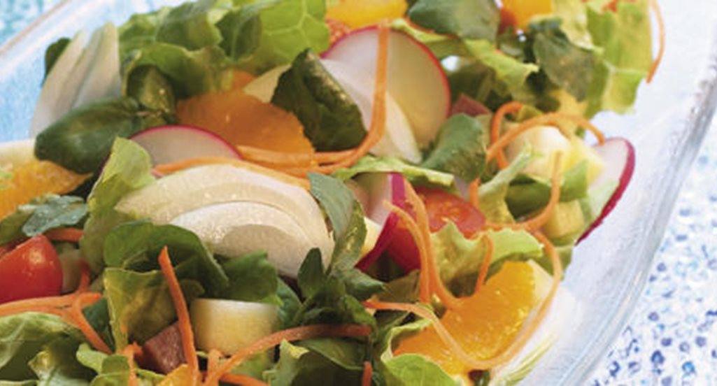 - Ripe as folhas de alface, rale a cenoura, corte os rabanetes em rodelas finas, separe as folhinhas de agriões, descasque e corte a cebolinha em gomos finos, corte a maçã em cubinhos e a laranja em gomos e limpe-os completamente de qualquer pele branca.