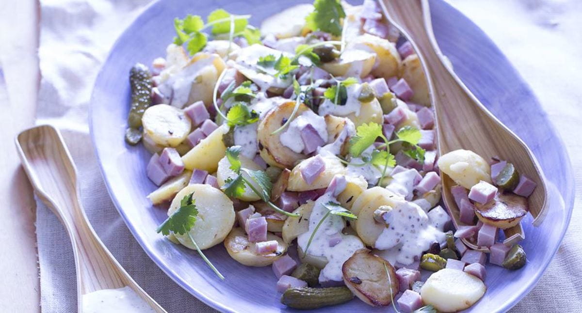 - Derreta metade da Vaqueiro Clássica e o dente de alho numa frigideira larga e salteie metade das rodelas de batata de ambos os lados até estarem douradas. Tempere com pimenta moída na altura e retire-as para outro recipiente. Repita a operação com as restantes batatas. Junte os pepinos de conserva cortados em rodelas finas e os cubinhos de fiambre e misture bem.