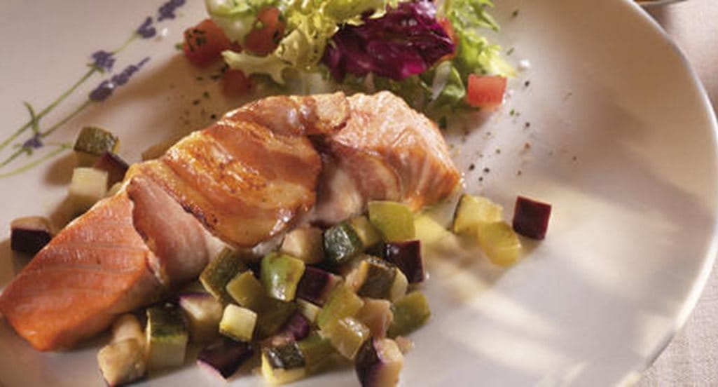 - Corte o salmão em 4 tranches e enrole cada uma, numa fatia de bacon. Aqueça metade daVaqueiro Líquidanuma frigideira e introduza aí os rolos de salmão com a pele virada para baixo. Deixe alourar um pouco, volte os rolinhos e aloure do outro lado, deixando-os ficar com o interior rosado.