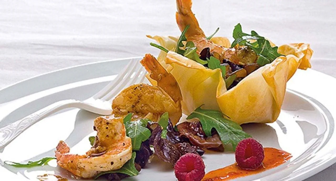 - Distribua pelas taças de massa filo, coloque-as nos pratos de serviço e pingue em redor com molho vinagreta.