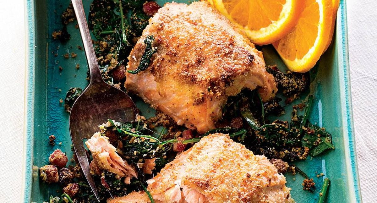 - Disponha uma colherada da mistura preparada sobre cada filete, enrole e coloque os rolinhos de salmão num tabuleiro de louça. Barre-os com a maionese e cubra-os com a restante farofa.