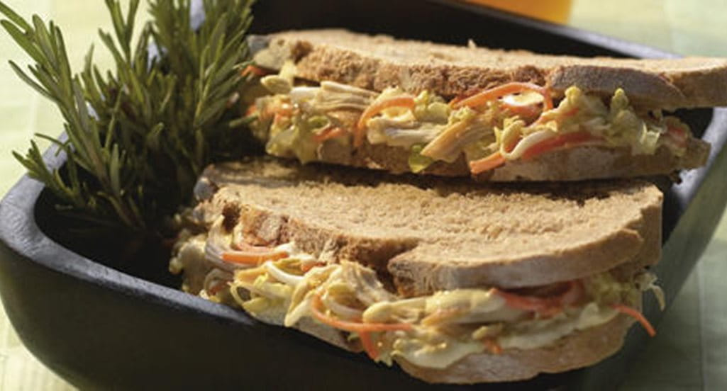 - Entretanto lave e escalde os rebentos de soja em água a ferver durante 1 minuto, escorra, passe por água fria corrente e enxugue bem. Pele e rale a cenoura. Corte a couve chinesa em juliana fina, lave e enxugue bem. Retire os peitos de frango da frigideira, deixe arrefecer e desfie a carne. Misture os rebentos de soja, a cenoura, a juliana de couve e o frango desfiado com a maionese. Barre 8 fatias de pão de centeio com a pasta preparada e cubra-as com as restantes fatias de pão.
