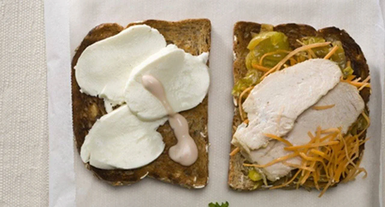 - Toste levemente as fatias de pão na torradeira e depois barre-as ligeiramente com maionese.