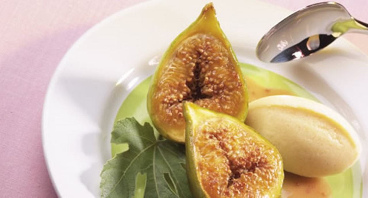 - Lave os figos e corte-os ao meio. Deite o restante açúcar e aVaqueiro numa frigideira e, quando a margarina estiver derretida e o açúcar completamente dissolvido, introduza os figos com a parte cortada virada para baixo. Deixe caramelizar sobre lume brando durante cerca de 5 minutos, agitando a frigideira de vez em quando. Volte os figos cuidadosamente com a ajuda de uma espátula e deixe cozinhar do outro lado mais 3 minutos. Retire os figos da frigideira cuidadosamente e reserve. Adicione ao molho que ficou na frigideira o mel e o sumo do limão. Deixe ferver mexendo com uma espátula.