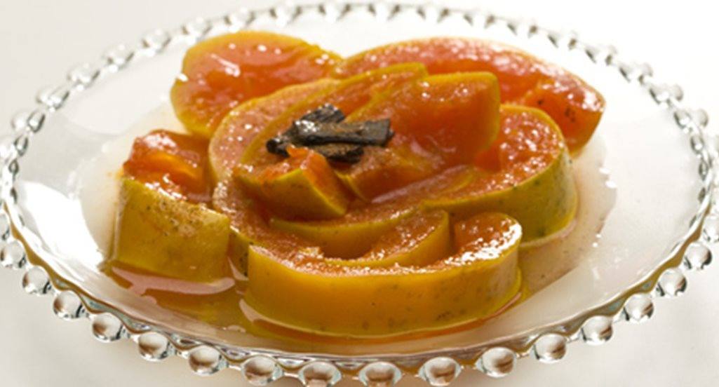 - Entretanto abra as papaias ao meio, limpe-as de sementes e corte-as transversalmente em fatias com cerca de 1 dedo de espessura. Junte a papaia à calda de açúcar e deixe ferver suavemente entre 30 a 40 minutos. A papaia deve estar macia, sem se desfazer.