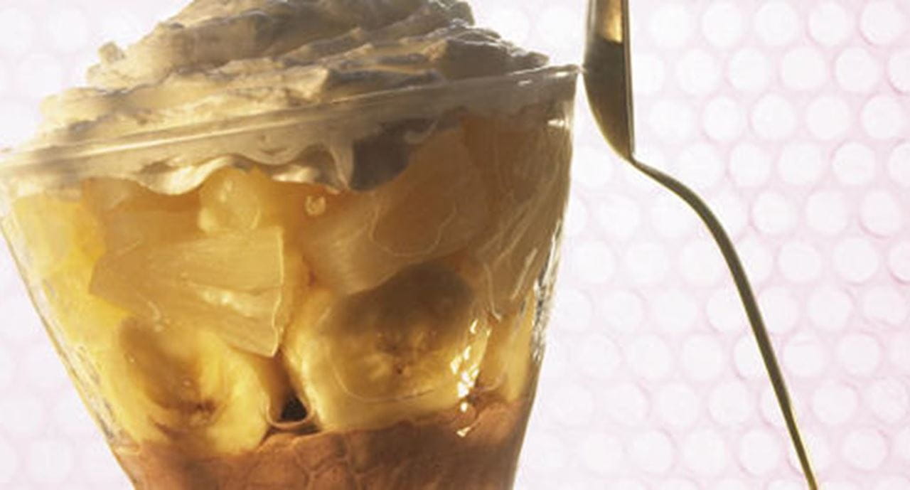 - Na taça em que vai servir vá dispondo os ingredientes em camadas; comece por uma camada de mousse, por cima espalhe rodelas de banana, uma camada de natas batidas, ananás em bocadinhos e repita as camadas até esgotar os ingredientes. Leve ao frigorífico e sirva bem fresca.