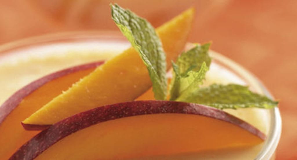 - Escorra a manga e leve a calda a ferver no lume ou no micro ondas. Espalhe os pedaços de manga sobre uma tarteira de vidro ou de louça.