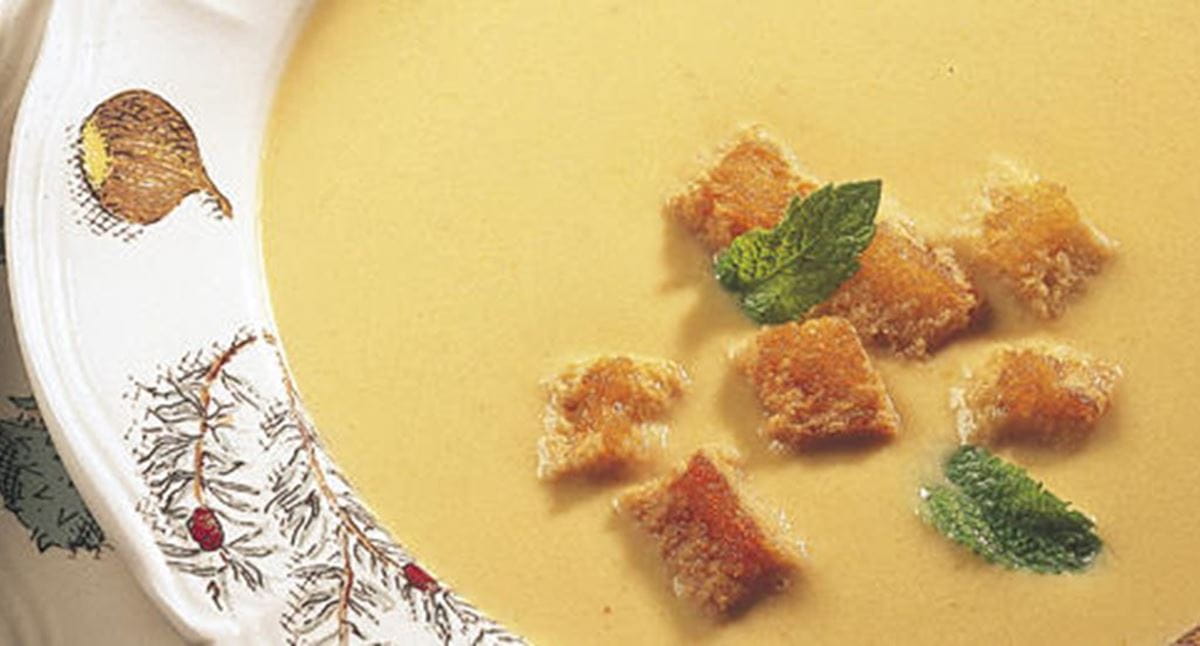 Sirva com quadradinhos de pão frito e 1 raminho de hortelã em cada prato.