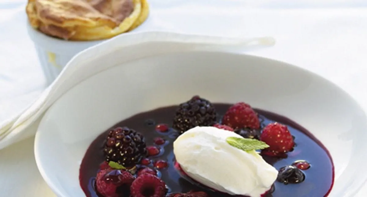 Sopa de frutos vermelhos com soufflés e nata fresca