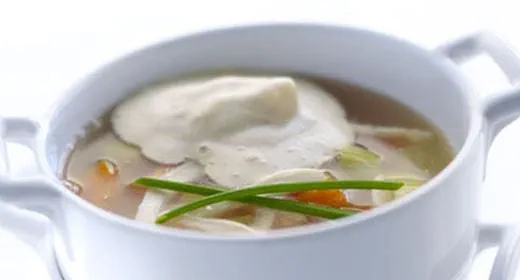 - Bata os ovos com uma pitada de sal e de pimenta e deite-os em fio sobre a sopa a ferver suavemente, mexendo sempre com um garfo para que coagulem em farrapos.