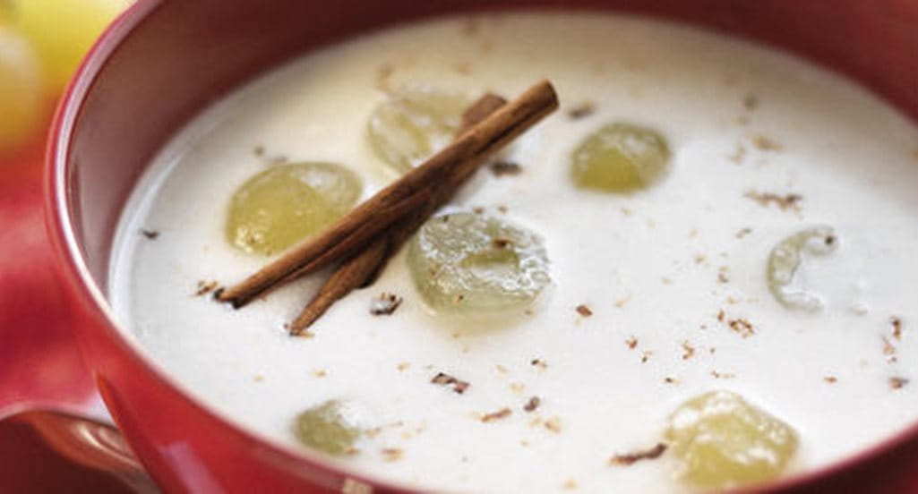 - Deite no recipiente onde vai servir, perfume com uma pitada de noz moscada e de pimenta moída na altura e mexa. Leve a refrescar no frigorífico durante 1 hora pelo menos. Entretanto, aproveite para lavar e pelar os bagos de uva. Se quiser pode abri-los e retirar também as grainhas.