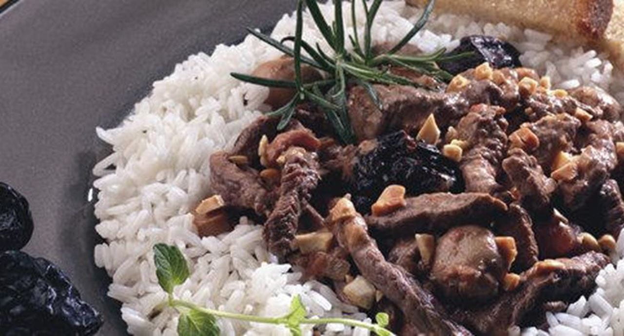 - Descasque e pique a cebola e leve a alourar num tacho com a Vaqueiro Alho e a folha de louro. Introduza a carne e deixe saltear, mexendo até alourar por igual. Tempere com sal e pimenta e regue com o vinho branco. Quando começar a ferver, adicione o conteúdo da lata de tomate, tape o tacho e deixe cozinhar sobre lume brando durante cerca de 20 minutos. Junte depois os cogumelos escorridos e as ameixas pretas. Cozinhe, tapado, durante mais 10 minutos. Junte então as natas, mexa para as misturar bem e, quando retomar fervura, introduza as amêndoas. Coloque o strogonoff numa terrina, ou num prato coberto, e sirva acompanhado com arroz solto, ou puré de batata, e fatias finas de pão torrado ou frito.