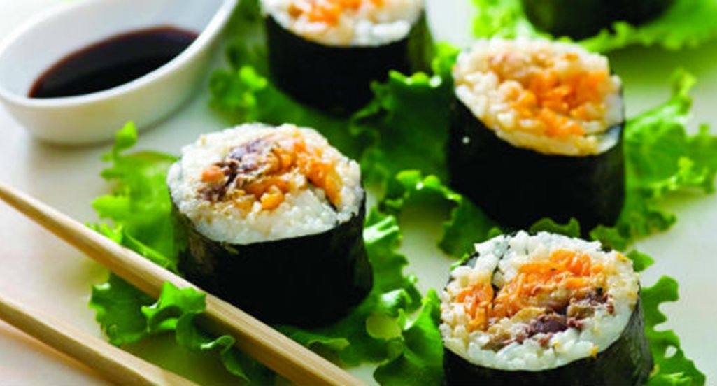 - Deite o arroz para sushi num passador de rede e lave-o em água fria corrente até a água sair transparente. Coloque o arroz num tacho junte-lhe a água fria e tempere com sal. Leve a cozer, tapado e sobre lume brando, durante cerca de 10 minutos. Retire do lume e deixe o arroz repousar tapado entre 30 a 40 minutos. Descasque a cebola e corte-a em rodelas finas. Derreta a Vaqueiro Clássicanuma frigideira, junte a cebola, e a folha de louro e deixe alourar. Adicione a cenoura ralada ao refogado e deixe cozinhar sobre lume brando até estar macia. Junte o colorau e tempere com sal, pimenta moída na altura e um pouco de vinagre. Mexa bem e retire do lume. Misture o mirim com o vinagre de arroz e o açúcar e leve ao microondas durante 50 segundos. Misture bem.