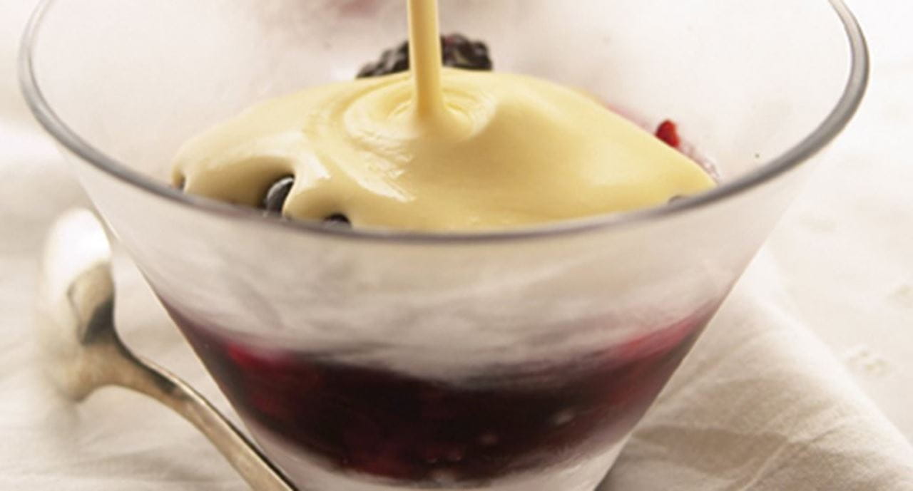 - Na altura de servir distribua o creme de queijo pelas taças, sobre a mistura de frutos e espumante, polvilhe com chocolate em pó e enfeite com folhas frescas de hortelã