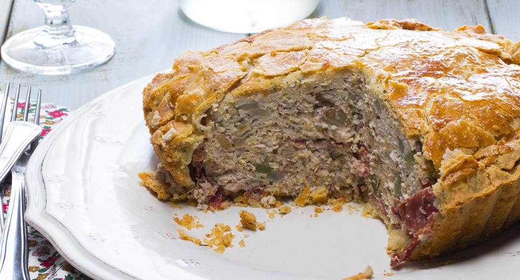 - 7. Forre o fundo e as paredes da caixa de massa com fatias de presunto. Por cima espalhe metade da mistura de carnes e cubra com as restantes fatias de presunto. Espalhe a restante mistura de carnes sobre as fatias de presunto alisando bem a superfície.