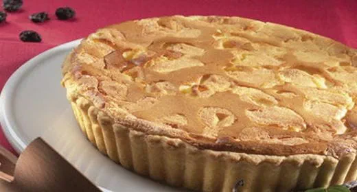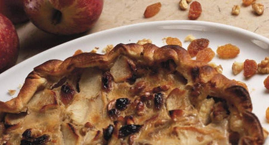 - Forre uma tarteira com a massa e por cima, espalhe as maçãs, as passas e as nozes salteadas.